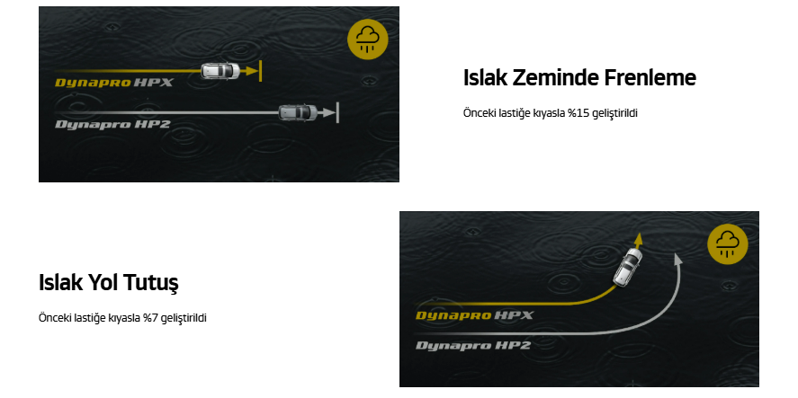 Gelişmiş kanal yapısı ve oluk sistemi, suyu hızla tahliye ederek suda kızaklama riskini ortadan kaldırır. Hankook Dynapro HPX, ıslak zeminde güvenliğinizi ön planda tutar.