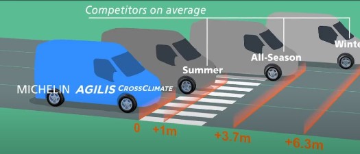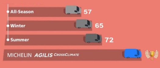 (1) Michelin’in talebiyle; 2017’nin Aralık ayında IDIADA tarafından Mercedes-Benz Sprinter araca takılı 235/65R16C 115/113 R ebadındaki Michelin Agilis CrossClimate ve ana rakiplerine ait premium yaz, kış ve dört mevsim lastikleri test edilmiştir. Michelin Agilis CrossClimate, kuru zeminde en kısa fren mesafesine sahip olmuştur.